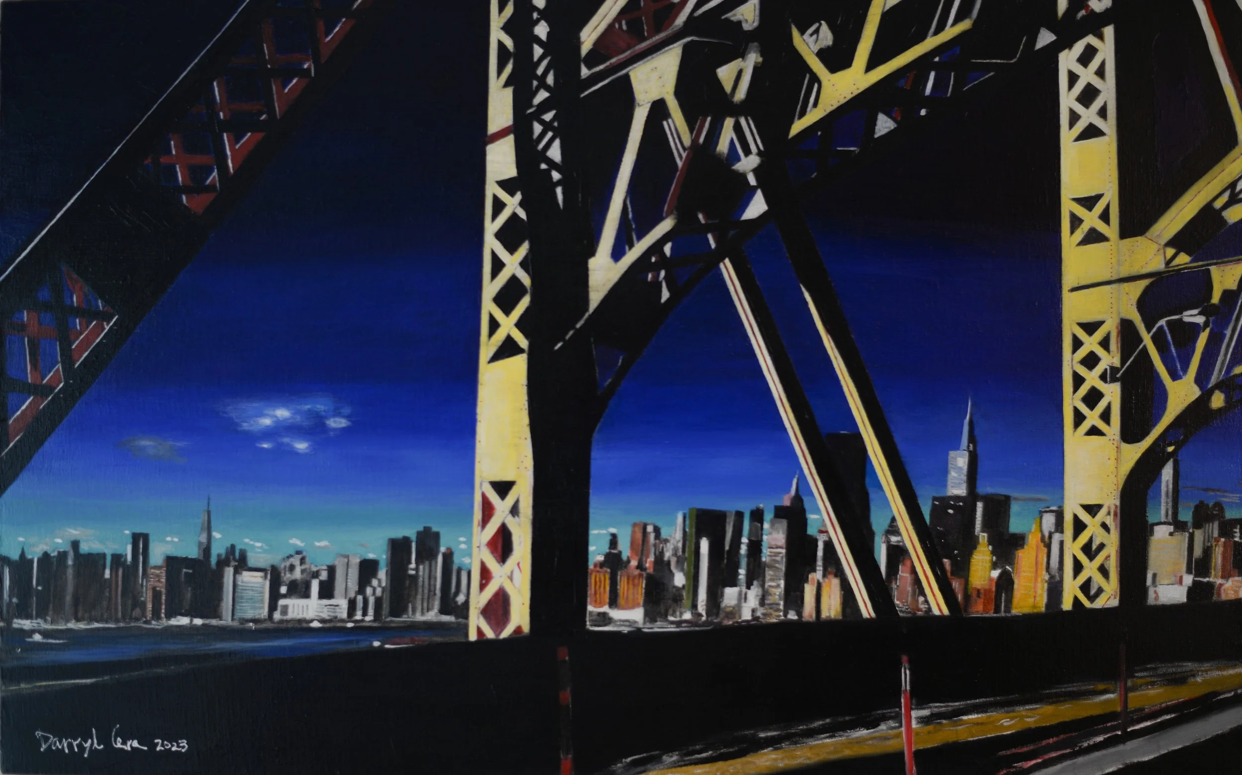 'Manhattan 59th St. Bridge' Oil on Linen 48x36" 2024. Stuck in traffic on bridge, fortunately, and photographed this image. And used as a basis for this painting.