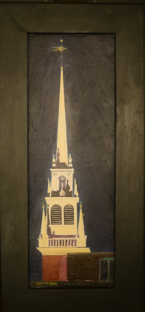 'Old North Church; Boston'; Oil on Linen Board 7.25x21.76" 1980. Paul Revere had something to do with this church; "...one if by land, two if by sea... ". The American Revolution.